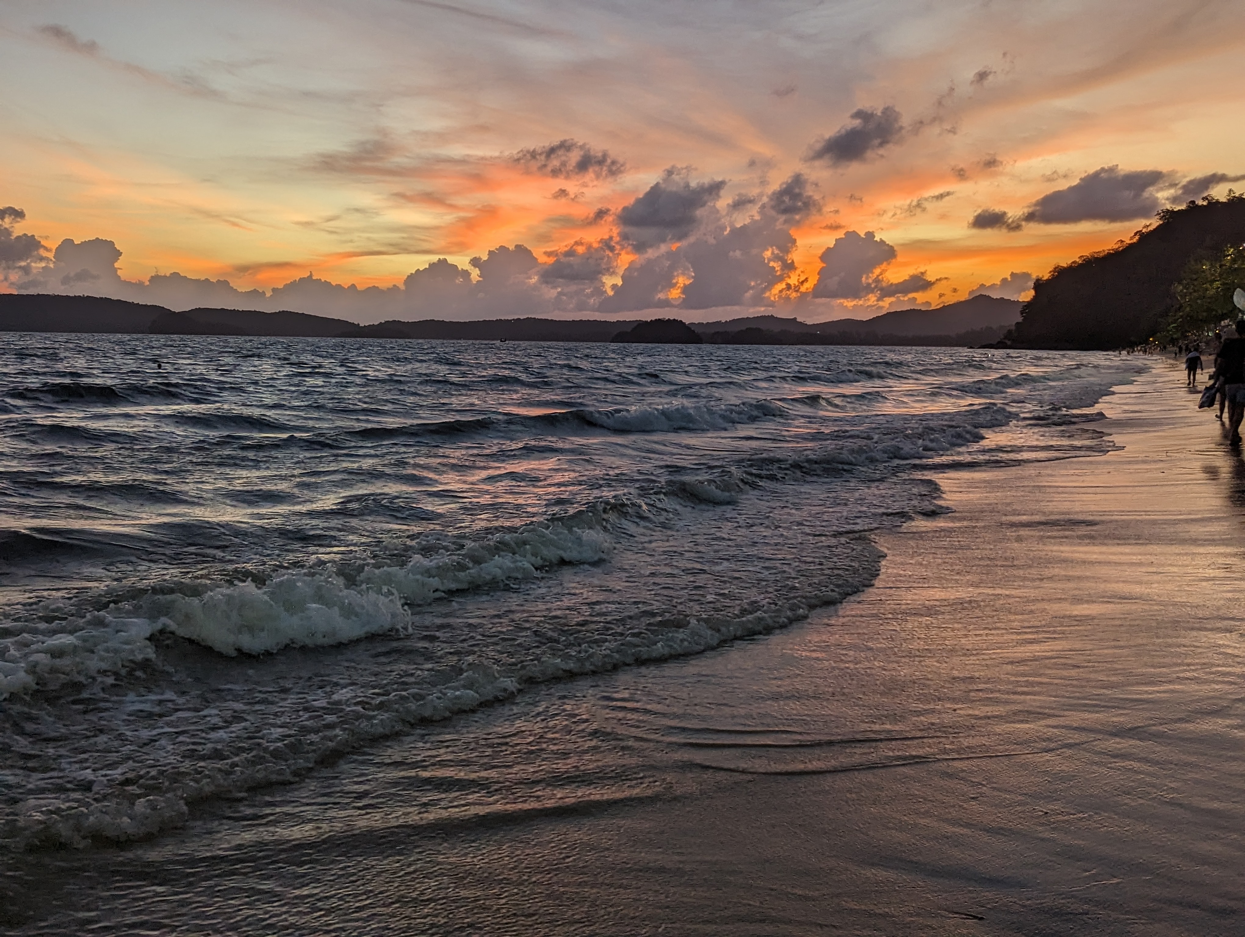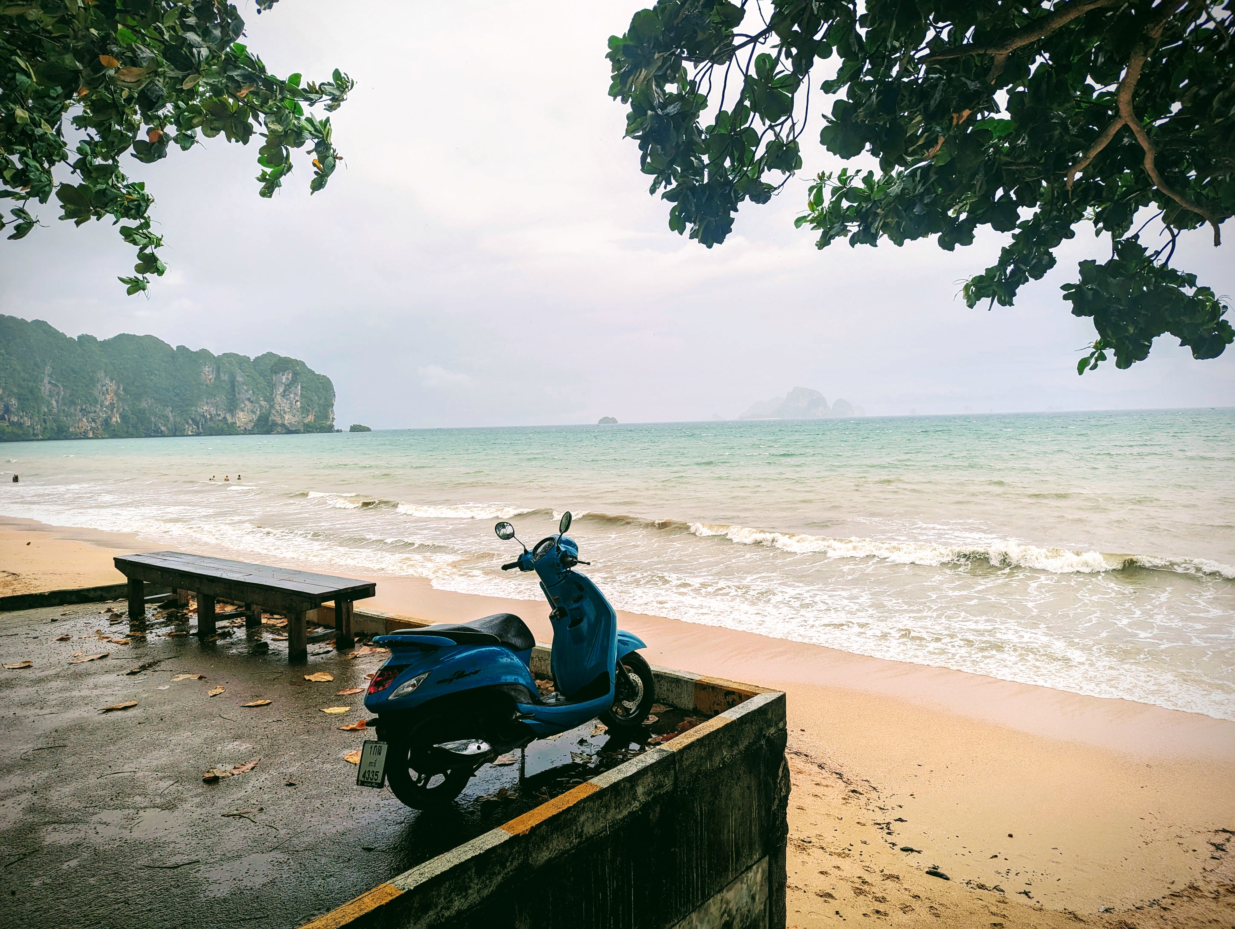 Thunderstorms for days… Walking the main street of Ao Nang Beach, past the many vendors sheltering in their stores or under their canopies… Drawn to the ocean that was gray and frothy with the winds whipping at the wave crests. I sat there for quite a few hours staring out of the ocean, feeling primally alive, fierce and calm. There are those of us that are drawn to be near the ocean in a storm, and truthfully, I thought I would see more of us there over those few days. But having such a vast and popular beach to myself was a privilege that only heightened my sense of gratitude, reflection, and inner strength. I think it’s good for the soul to be on one’s own from time to time, as long as the internal and external conditions are right. And for me they were… I honestly don’t know why the ocean has often been a soothing place for me. Whether I was sailing or doing water sports in my youth or taking every opportunity to get on somebody’s boat or just sitting oceanside whenever possible, it has always been one of the places where I can let go of the idea of me. Perhaps it’s the immense power and the changeability or volatility that reminds me no matter what I have inside my mind or in my history, this source of nature is much bigger than me and has been there for all of my ancestors and, if I have any descendants beyond my sons, it will still be there for them too. So that’s how I arrived in Krabi, Thailand…starting my time in a beach town where I have the beach to myself, being thoroughly, delightfully drenched by the warm rain, mesmerized by the gray green ocean.